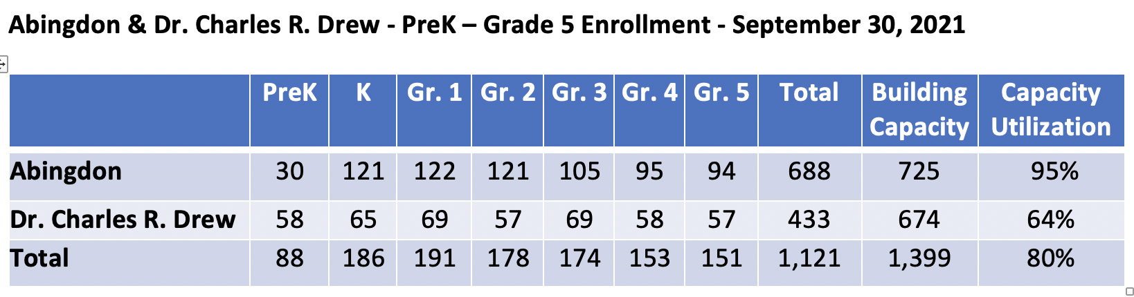 - The data tables show currently enrolled (Sept. 30, 2021) PreK to Gr. 3 students who reside in a planning unit (36060, 36061, 36090, 37070, 37100, 37101, 37102) proposed for reassignment from Abingdon to Dr. Charles R. Drew