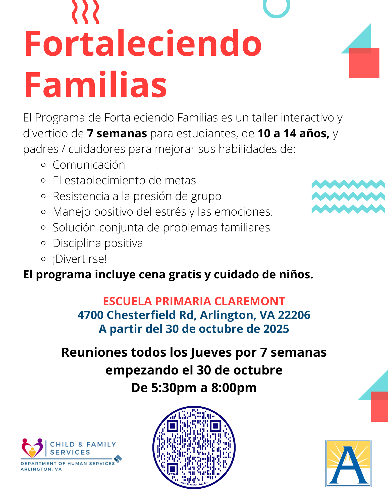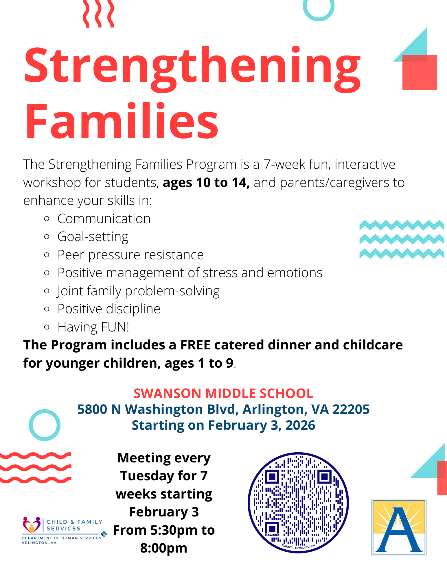 In Partnership with Arlington County, the Strengthening Families Program is a 7-week interactive workshop for students ages 10–14 and their parents/caregivers. The program helps families build skills in communication, goal-setting, resisting peer pressure, managing stress and emotions, problem-solving together, and using positive discipline, all while having fun!
